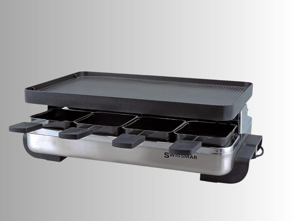 The Swissmar Classic Raclette Party Grill with Reversible Cast Aluminum Non-Stick Grill Plate/Crepe Top brings authentic Swiss dining to your home. This 8-person raclette grill is perfect for families who love interactive cooking experiences and groups of friends who want to create memorable dinner parties together.